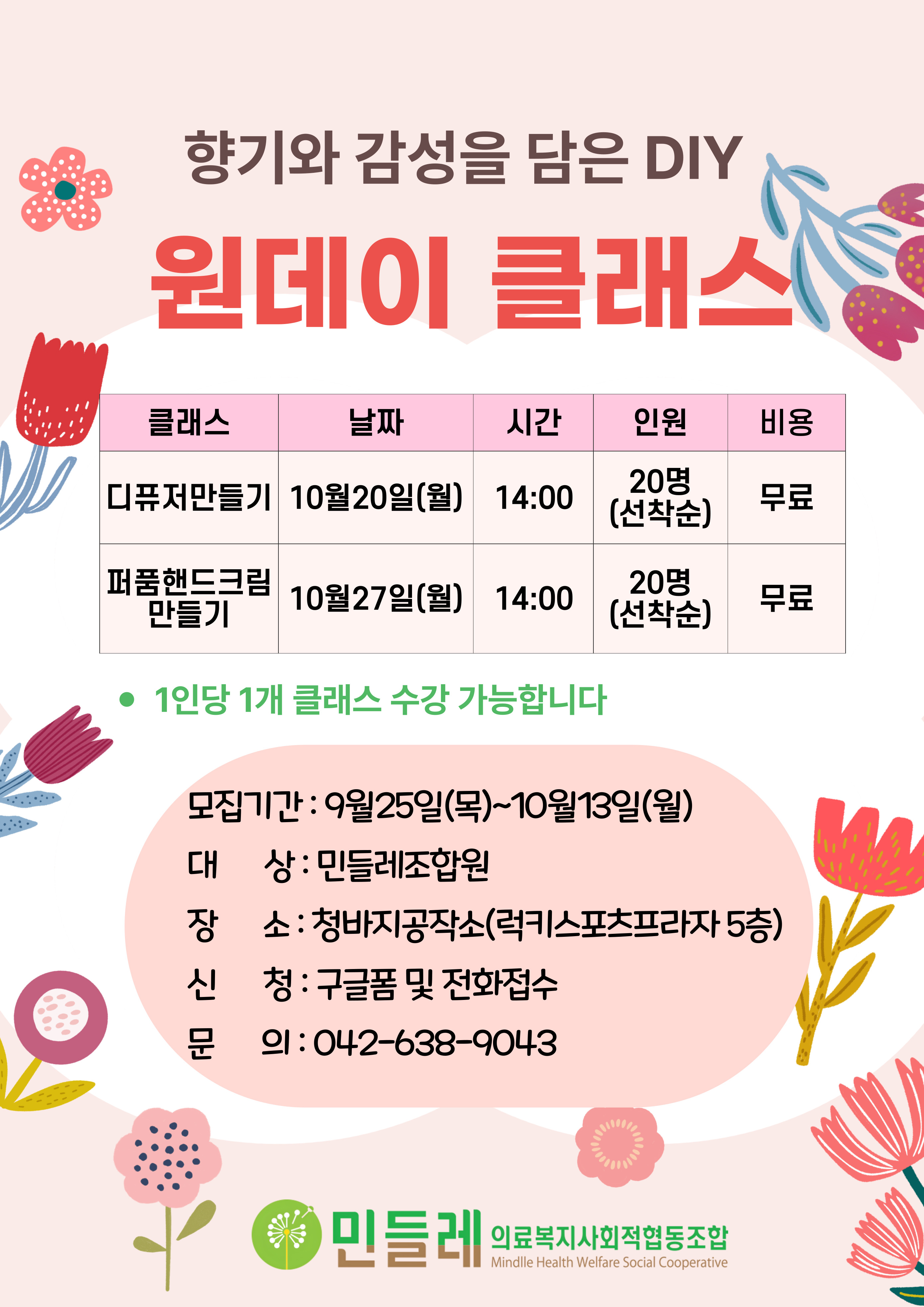 민들레조합원이면  누구나 신청 가능합니다 (1인당 1개 클래스만 신청 가능합니다)